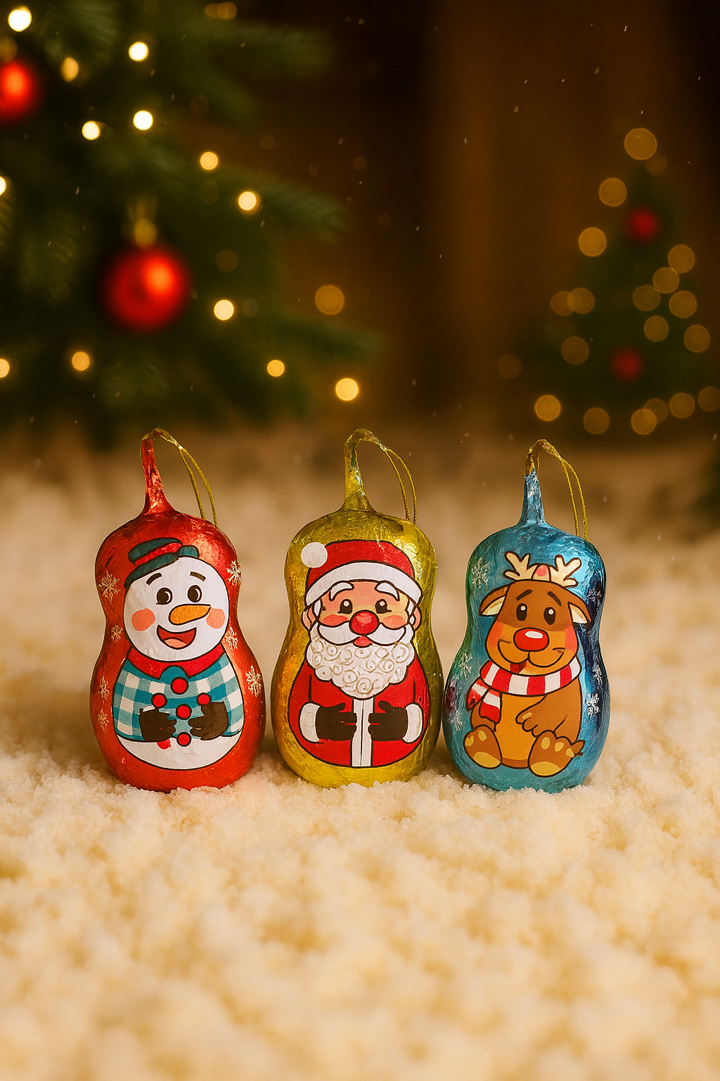 Figurines de NOEL en chocolat au lait creux, emballées sous papier alu coloré, avec un lien doré pour les accrocher.
